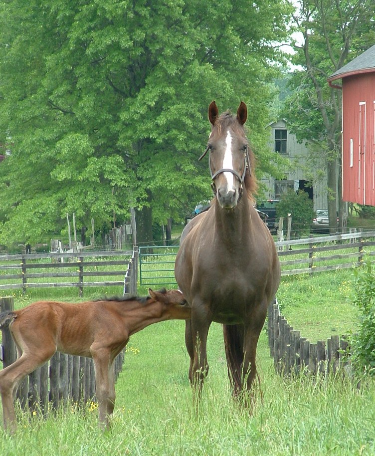| Illustra Enchant (Lillie) delivered an exquisite bay filly with 3 white socks and a small crescent star. Susan got to witness the birth which was a miracle, yet totally normal. Mom & baby are both doing well. We're calling the baby "Lizzie" after the Queens Elizabeth I & II, as she seemed so regal when first born and Lillie & Lizzie go together well. Watch here for updates. Inquiries will be invited on this foal. |
